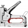Степлер мебельный REXANT с усиленной рукояткой выполнен из высокопрочной стали. Имеет регулировочный винт для оптимальной настройки силы удара. Предназначен для закрепления обивки мебели, сборки шкафов, укрепления плакатов, строительства парников, укладки напольных покрытий, закрепления проволочной сетки и других подобных работ. Корпус оснащен специальной скобой, которая фиксирует ручку и упрощает хранение степлера. Инструмент укомплектован скобами. Степлер может использоваться в быту, мастерских, на производстве.