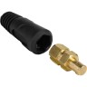 Вилка кабельная REXANT – быстросъемный соединительный разъем (штекер), который монтируется на кабель сварочных аксессуаров (держатель электрода на проводе или зажим массы) для последующего простого и надежного соединения к корпусу сварочного аппарата, при наличии на нем соответствующего разъема или с кабелем с целью общего увеличения длины кабеля.